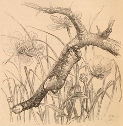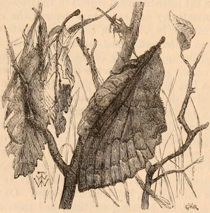 We now come to a closer and more special disguise. Many of the moths that rest during the day on palings or on the trunks of trees are marked and coloured so as to match the tints of the bark and lichens, and thus to escape observation. As examples of this numerous class, we may mention two of our commonest species—the "Dagger" (Acronyctapsi) and the pretty green Agriopis aprilina. The Lappet moth (Gastropacha quercifolia) when at rest resembles very closely a small bunch of dead leaves; and at a little distance could hardly be taken to be a moth, so curiously does it spread out its hind wings so as to project beyond the others. The accompanying cut (fig. 193) by Mr. T. W. Wood, is an accurate representation of this insect in its attitude of repose.