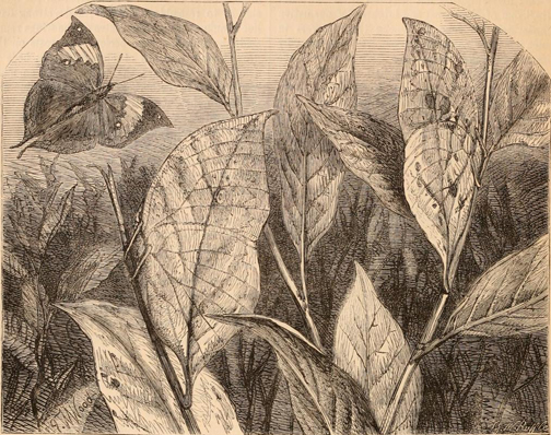 orange-red, is so tinted and mottled on the under side as to resemble a dry leaf; and a strong dark line running through the centre of the wings represents the midrib. This species often rests on the ground, on the banks of streams, or on beds of gravel, and depresses the upper wings so much between the lower ones as to form an outline very similar to that of a leaf; and this is no doubt a great protection to it; for although so large and showy an insect, it is very plentiful.