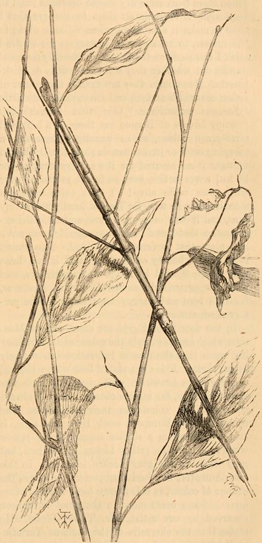 The true Phasmidæ, or Stick-insects, are the most curious, perhaps, of all, and they are much more abundant in the eastern forests than the Leaf-insects. They vary from a few inches to a foot long, and are almost always of the colour and shape of pieces of stick, the legs forming the branches. One of the most curious facts connected with them is that they seem to know that if they rested in the symmetrical attitudes in which they are always drawn, with their legs spread out uniformly on each